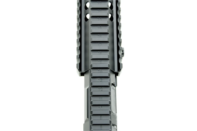 Das herausstechendste Merkmal ist ebenso die echte durchgehende Picatinny Schiene mit T-SLOT Schaftfräser Gravur. Upper und Vorderschäfte haben in der Regel die Eigenschaft, dass die Top Rail beider Teile, also die oben liegende Schiene, nie die gleiche Bauhöhe haben, hinzu kommt ein T-Slot und ein Winkelversatz. Durch eine ovale Passung am Upper Receiver sitzt der Handguard ohne jeglichen Versatz, die Befestigungsschraube greift in die Aussparung der Laufhaltemutter ein, somit sitzt der Handschutz absolut spielfrei und fest.