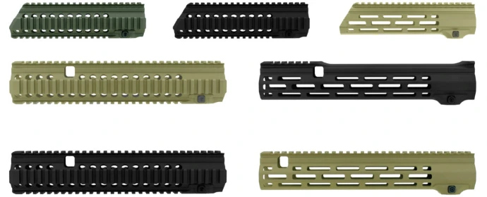 Der M4s® Handguard kann einfach und schnell mittels einer Patrone in wenigen Sekunden demontiert werden, zur Befestigung von Zubehör kann zwischen einem standardisierten STANAG 4694 NATO Quadrail Handguard (PICATINNY 1913 kompatibel) oder einem M-LOK® Handguard in Kombination mit einer NATO Toprail in 2 unterschiedlichen Längen gewählt werden, alle Handguards sind freischwingend, der M-LOK® Handguard besitzt als einziger seiner Art ein 7-faches längsverlaufendes M-LOK® Schienensystem, somit kann etwaiges Zubehör, wie z.B. SUREFIRE Einsatzlampen oder Lasersysteme wahlweise an 7-Positionen montiert werden. Als Upgrade sind unterschiedliche Vorderschäfte in unterschiedlichen Längen und Formen sowie Farben erhältlich.